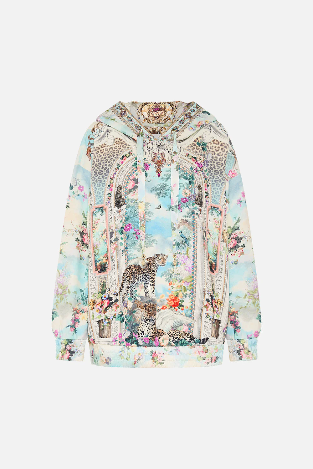 The We Always Have Alexandria Silk Band Oversized Hoodie With Pockets wanders through grand hallways lined with opulent archways. Leopard print highlights entwine with delicate florals and decorative golden fronds. This luxury oversized hoodie features a generously relaxed fit throughout the body and sleeves gathering into elasticated cuffs and hemline.