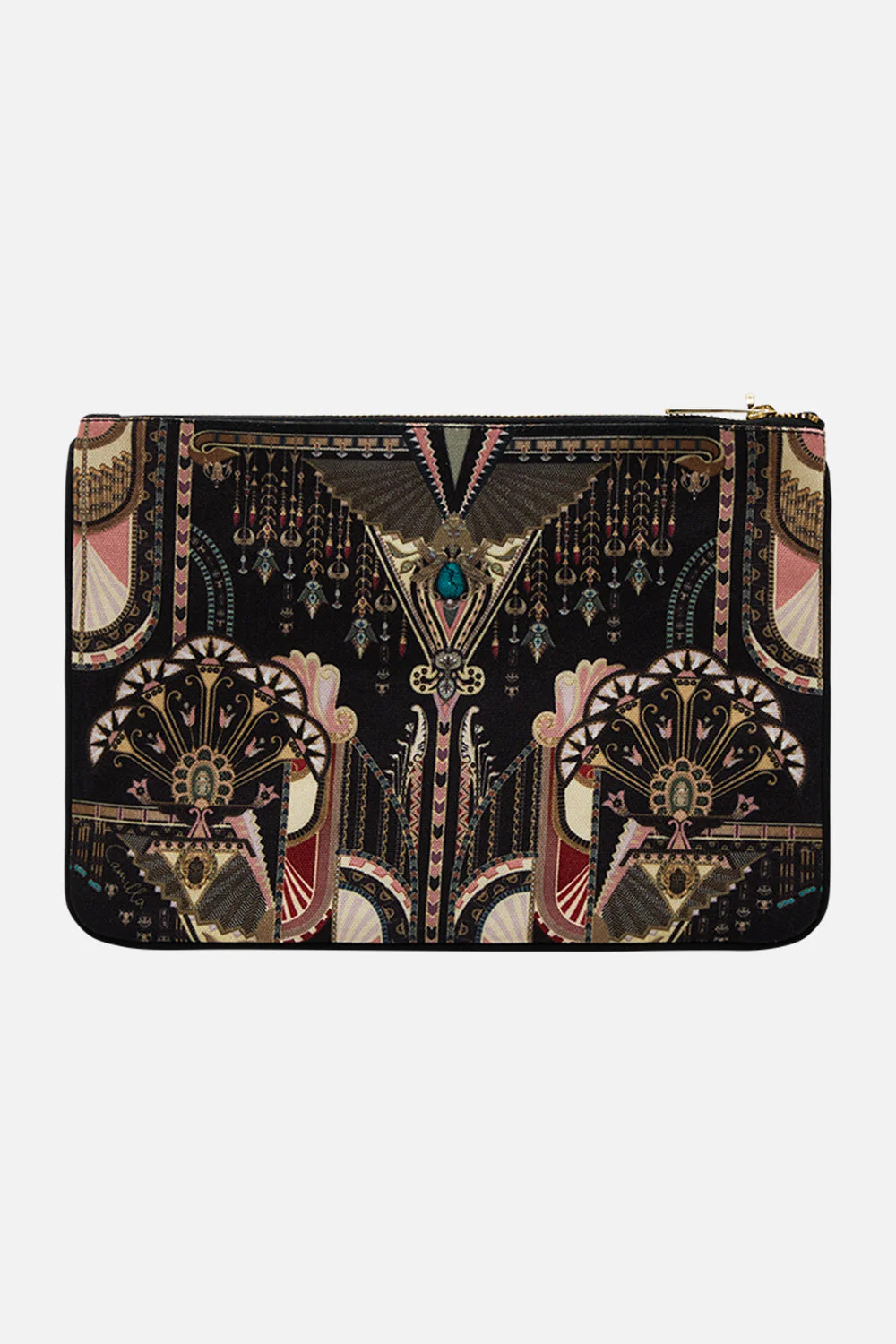 The They Call Her Nefertari Small Canvas Clutch depicts an ancient world of ankhs, scarabs, Egyptian phoenixes, and majestic gods. Featuring a beautifully bespoke print, this luxury clutch bag showcases a streamlined rectangle silhouette adorned with contrast piped edges, a zip top enclosure, finished with a custom CAMILLA parrot clip. The internal pocket and generous main compartment keep your treasures stored in style. Explore more from the House Of The Sun collection.