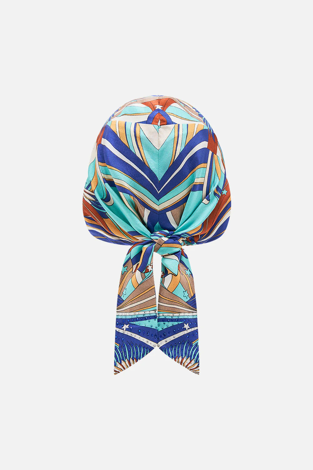 The Oasis Oracle Headscarf delves into gentle geometric waves of blues and navy to create a vividly opulent sanctuary. This luxury silk headscarf features a sumptuously generous expanse that drapes over your tresses to create a streamlined silhouette. Finished with an elasticised back detail and lavish ties. Explore more from the House Of The Sun collection.