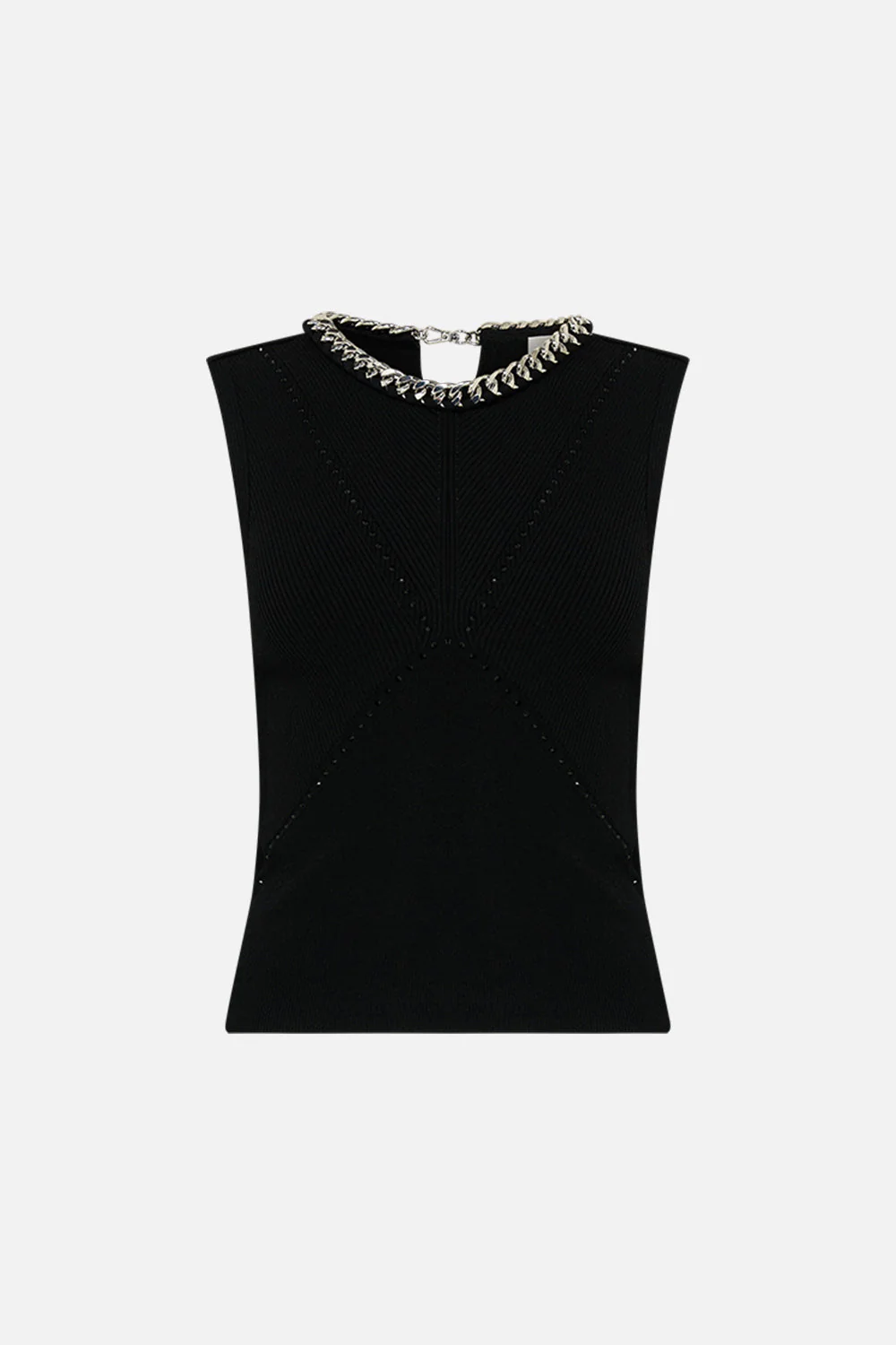 The Cartouche Kingdom Sleeveless Knit Tank Top pays homage to the dark heart of the tombs of ancient kings and the intricate bridge between worlds. This luxury knit top features a chic crew neckline that flows into a fitted silhouette that falls to hip level. With chain embellished details and a keyhole and button back detail, this CAMILLA knit top exudes statement styling.