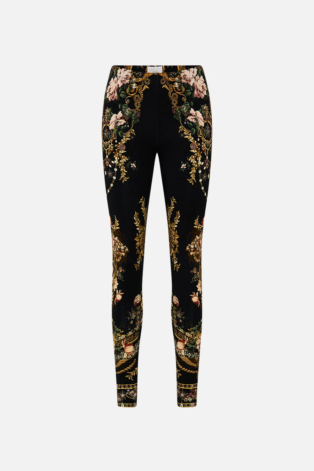 The Dynasty Daze Leggings are an immersion into an opulent world of rich black adorned with delicate florals and decorative golden fronds. Immerse yourself in the timeless elegance of our luxury leggings, adorned with classic hand-embellished CAMILLA crystals, these leggings are designed featuring an ever-so-comfortable elasticated waistline that ensures a perfect fit. The fitted silhouette skims your curves with a full-length cut, these leggings elegantly dance at the ankle