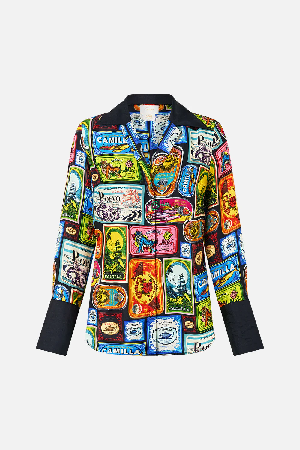 Designed in Australia, The Sal Do Mar Pyjama Shirt invites you to Portugal’s coast, where bold CAMILLA sardine cans celebrate the sea. A vibrant nod to Lisbon’s Saint Anthony Festival of music, laughter, and fresh flavours. Lovingly handcrafted, this CAMILLA silk pyjama shirt features a relaxed fit throughout the body that falls to a hip-length hemline. The relaxed long sleeves feature wide split cuffs that drape beautifully at the wrist.