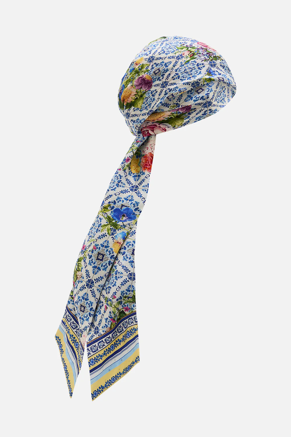 Designed in Australia, The Wall To Wall Wonders Headscarf With Long Ties captures the grandeur of Queluz Palace, with soft blues and golden yellows of Azulejo tiles, blending history and artistry in a panoramic view of Portugal’s timeless beauty. Lovingly handcrafted, this CAMILLA printed headscarf features long, adjustable ties at the back and is adorned with resplendent crystal embellishments, adding a touch of elegance to its versatile design