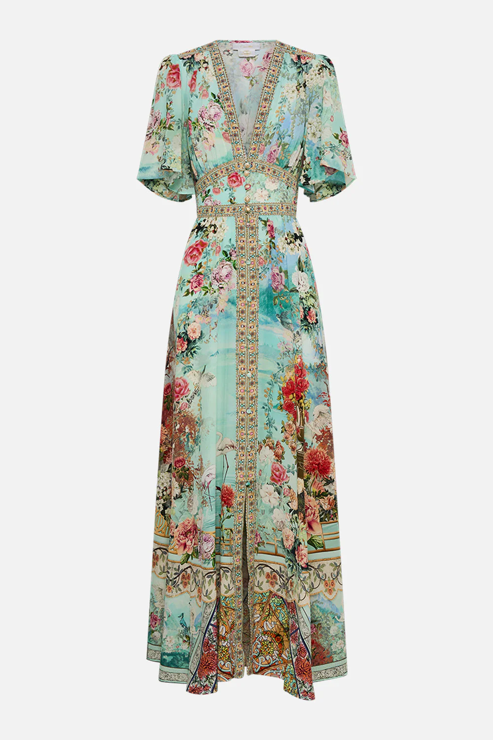 Designed in Australia, The Jewellery Museum Shaped Waistband Dress With Flutter Sleeves weaves together the opulent mystique of Alexandria’s hidden treasures with sumptuous florals and the richness of azure skies, crafting a serene valley brimming with elegance. Lovingly handcrafted, this alluring silk maxi dress showcases a delicate V neckline and a fitted bodice that cinches into an elastic shirred back panel. The sweeping maxi skirt gently dances at ankle length for luxurious billow.