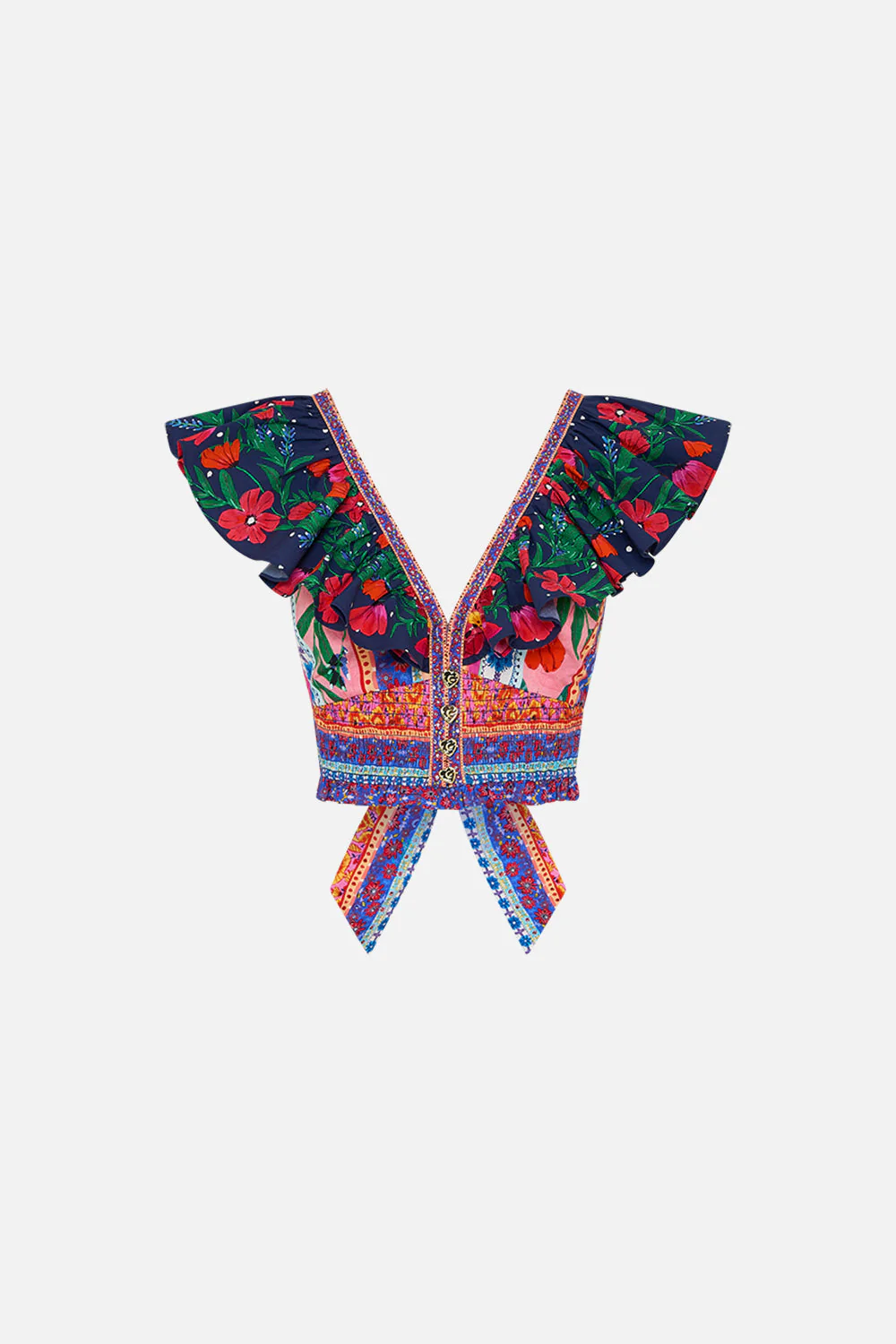 The Roeqiya's Realm Deep V Frill Short Sleeve Top peers into a mesmerising tapestry that encapsulates the essence of Roeqiya Frisās artistic vision. This rich collage from her celebrated visual repertoire immerses viewers in a world of vivacious desert landscapes, lush gardens, and dreamlike vistas. This luxury CAMILLA ruffle sleeve top features a shaped bust detail that flows into a cropped silhouette. With generous back ties and a button front detail this luxury frill sleeved top exudes CAMILLA decadence.