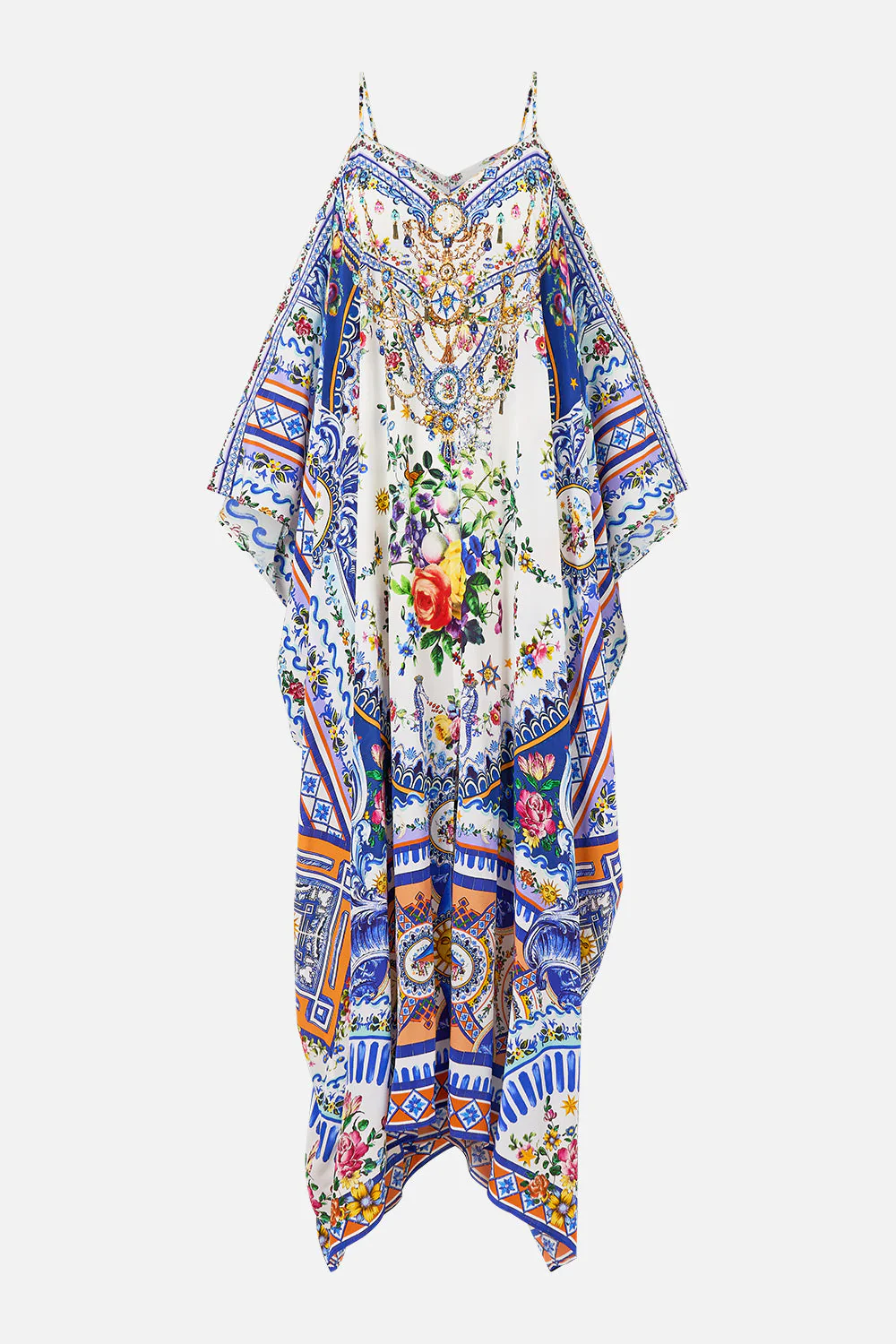 Designed in Australia, the Tiles Darls Drop Shoulder Strap Kaftan reads the language of florals and tiles, blue and orange hues intertwine, a celebration of artisan hands and enduring beauty. Lovingly handcrafted, this luxury CAMILLA silk kaftan features a relaxed fit throughout the body that falls to a full length hemline. The drape details created by the wide drop shoulder sleeves are able to be worn a multitude of ways as a drop shoulder style or with the arms threaded through as a strappy camisole style dress with added volume.