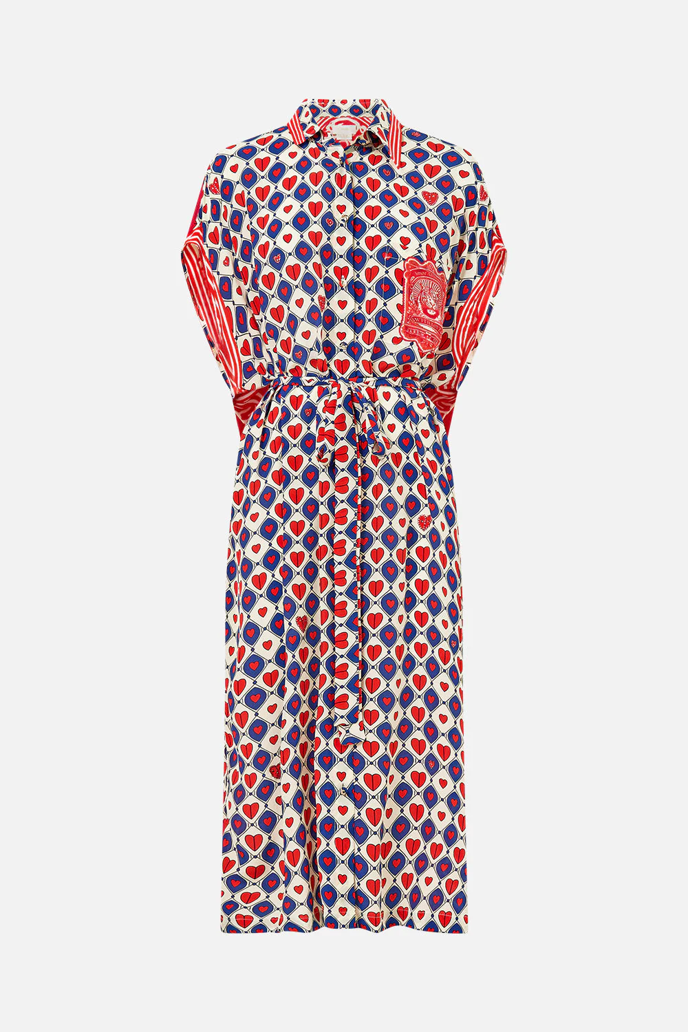 Designed in Australia, the Rinse & Roar Sleeveless Shirtdress prowls with daring contrasts, tigers emerge amidst red and blue strokes creating a monochromatic masterpiece of wild wonder. Lovingly handcrafted, this shirtdress offers a relaxed fit in midi length. The button-through front and waist tie provide a flattering silhouette, while crystal embellishments elevate this effortless everyday piece.