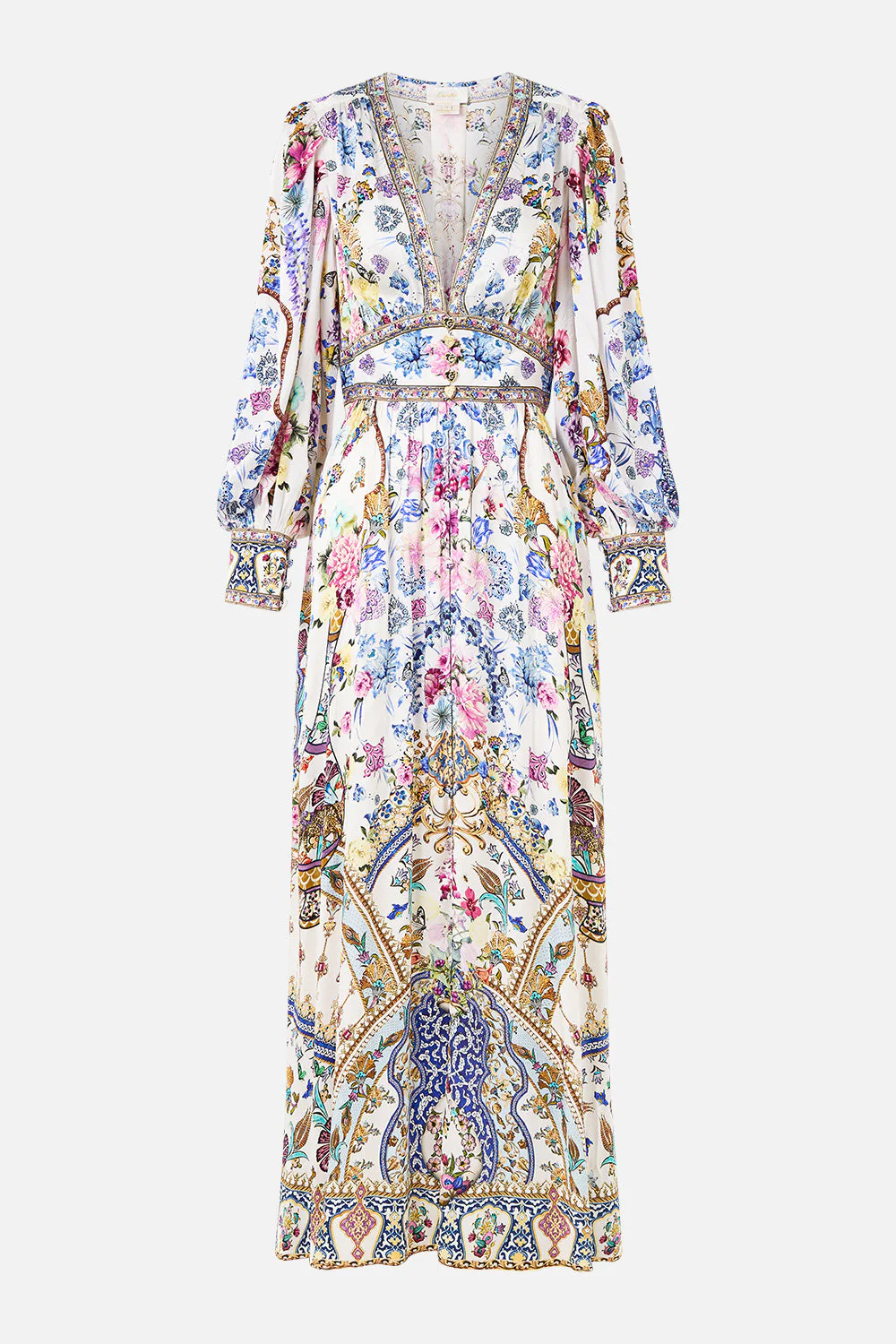 The All About That Lace Shaped Waistband Dress With Gathered Sleeves is a handcrafted silk silhouette designed by our in house artisans. Reimagined in an exclusive limited edition print, our shaped waistband dress features a V neckline, framed by a front button fastening that meets a shirred back for adjustable comfort. Its soft, gathered sleeves cascade beside the form, adding fluidity with every step, its finished with delicate frills and intricately placed crystal embellishments for romantic allure.