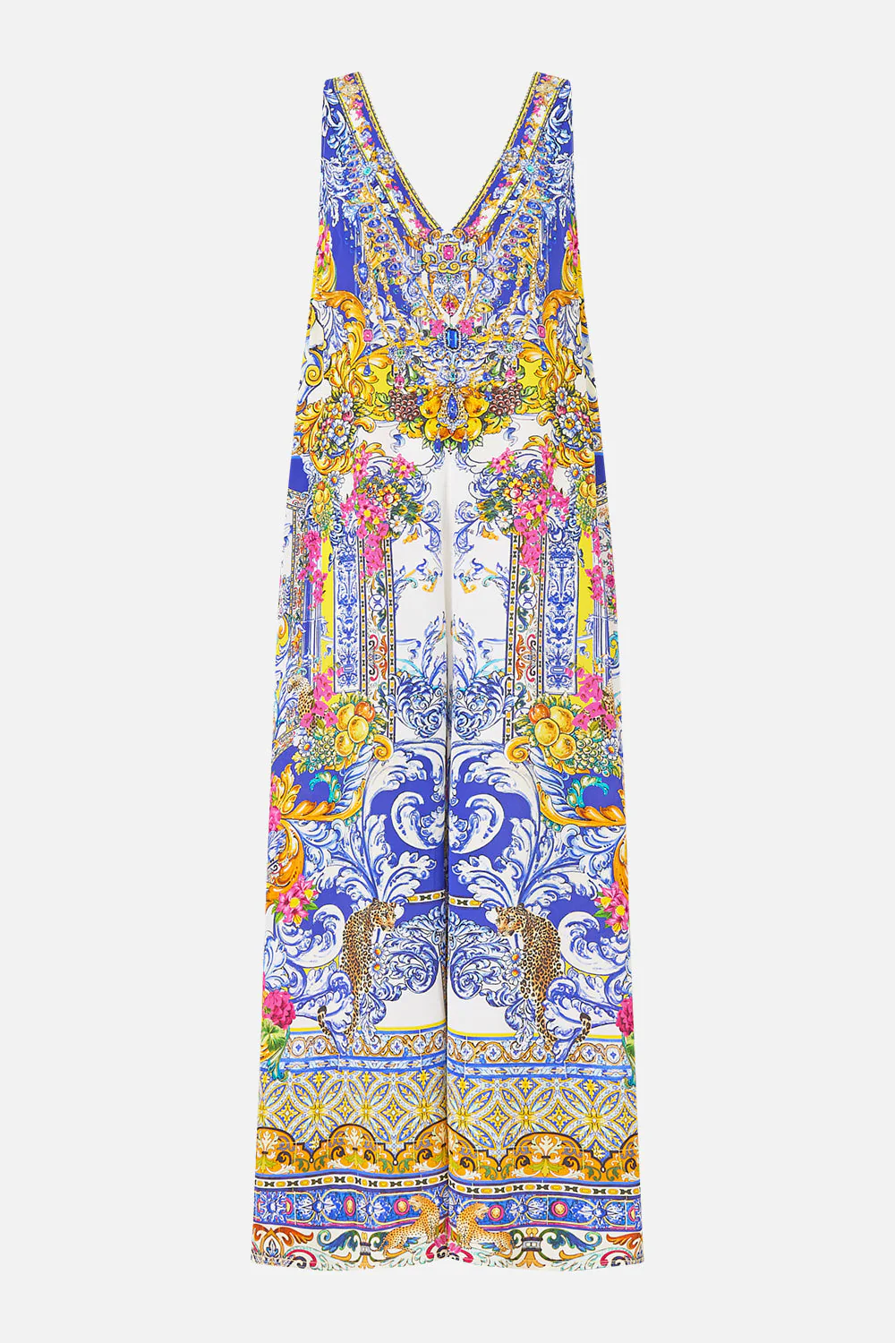 The España Nirvana V Neck Flared Jumpsuit is a handcrafted silhouette designed by our in-house artisans. Created in an exclusive limited edition print, this silk v-neck jumpsuit is cut in a relaxed fit and falls to a flared, full length hemline. It features an invisible zipper at the back and inseam pockets for effortless versatility while intricately placed crystal embellishments add luminous details.