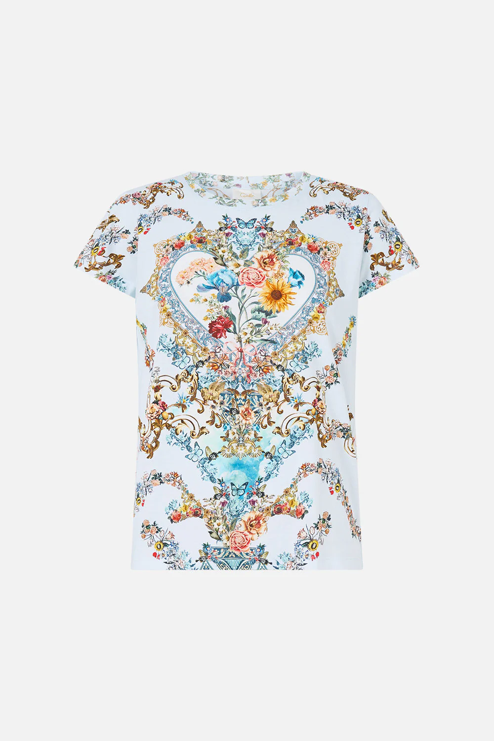The Seville Sweetheart Slim Fit Round Neck T-Shirt is a handcrafted silhouette designed by our in-house artisans. Imagined in an exclusive limited edition print, this cotton slim fit t-shirt is adorned with intricately placed crystal embellishment before being finished with a rounded neckline complete with ribbed detailing.